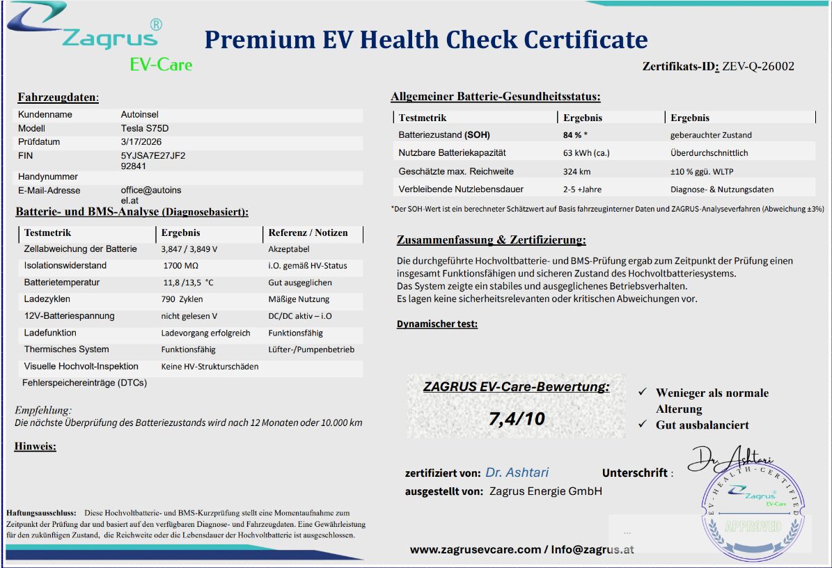 Der aktuelle State of Health (SOH) beträgt 84% und bestätigt eine solide Batteriekapazität für den Alltag.